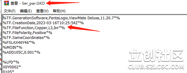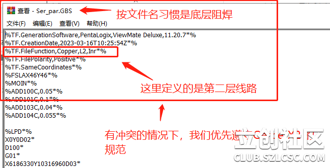我们看一下上面案例中的 GerberX2 文件内容是什么样的。备注:被水印挡住的文字是:有冲突的情况下,我们优先遵守 GerberX2 的规范。