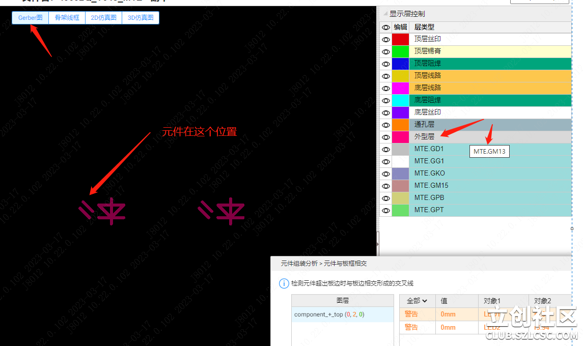 我们切换到Gerber视图位置,我们发现外型层取的是 GM13 层,(板子实际正确的外型层在GKO层,我们遵守的规范是 终极标准:某D系列软件外形层及非金属化孔及槽的标准及规范 https://www.jlc.com/portal/t6i10153.html),这个位置刚好画得有线条,被当成线框,如果与元件相接触就发生误报。