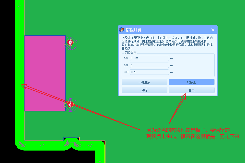 如上图,我们假设它是有效板子,要保留的,按上图操作,把这一块类型切换为板子,再执行生成。得到的锣带结果如下图效果