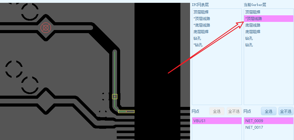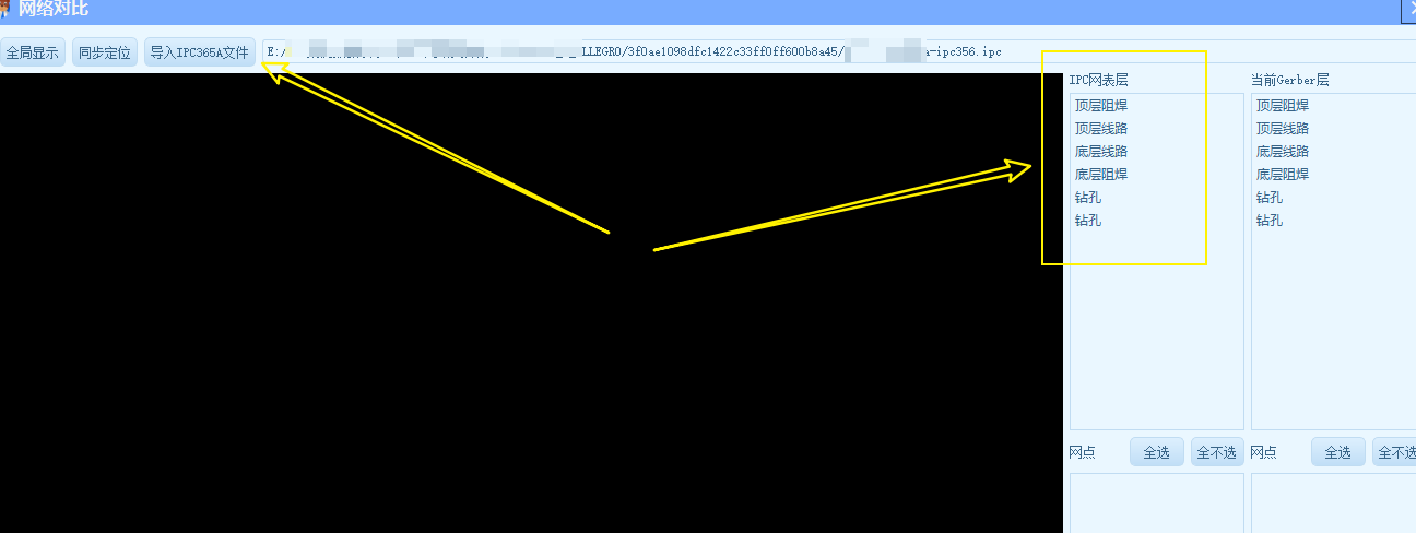 - 现在就可以进入网络对比界面了,按下图指示,选择你的网络文件,注意不同的EDA生成文件后缀名,不一定是ipc,导入后,就会自动展示【IPC网表层】