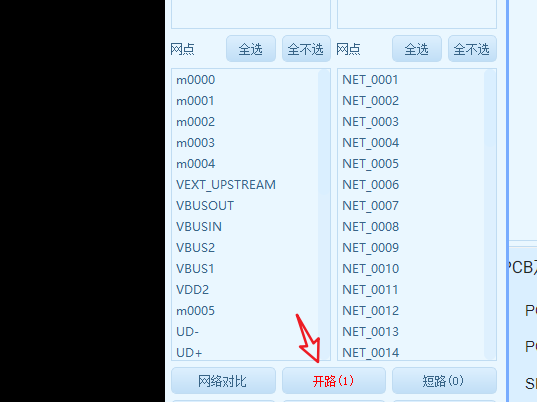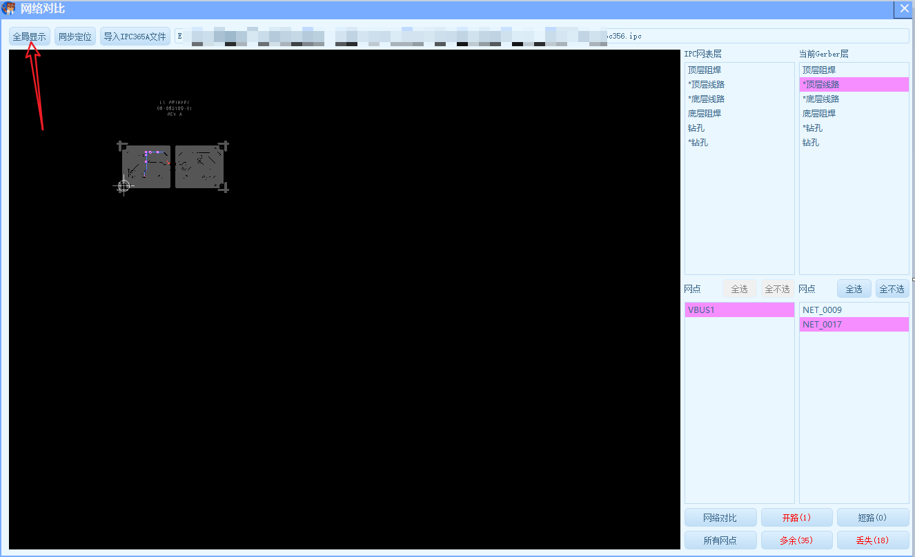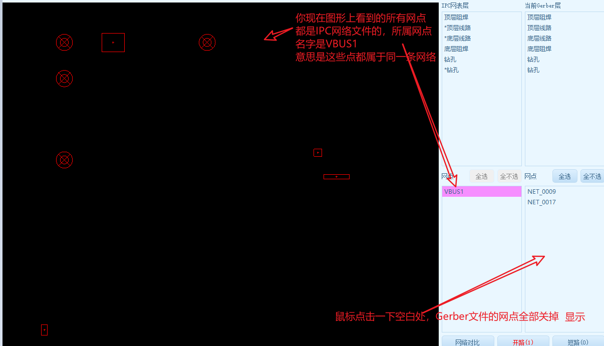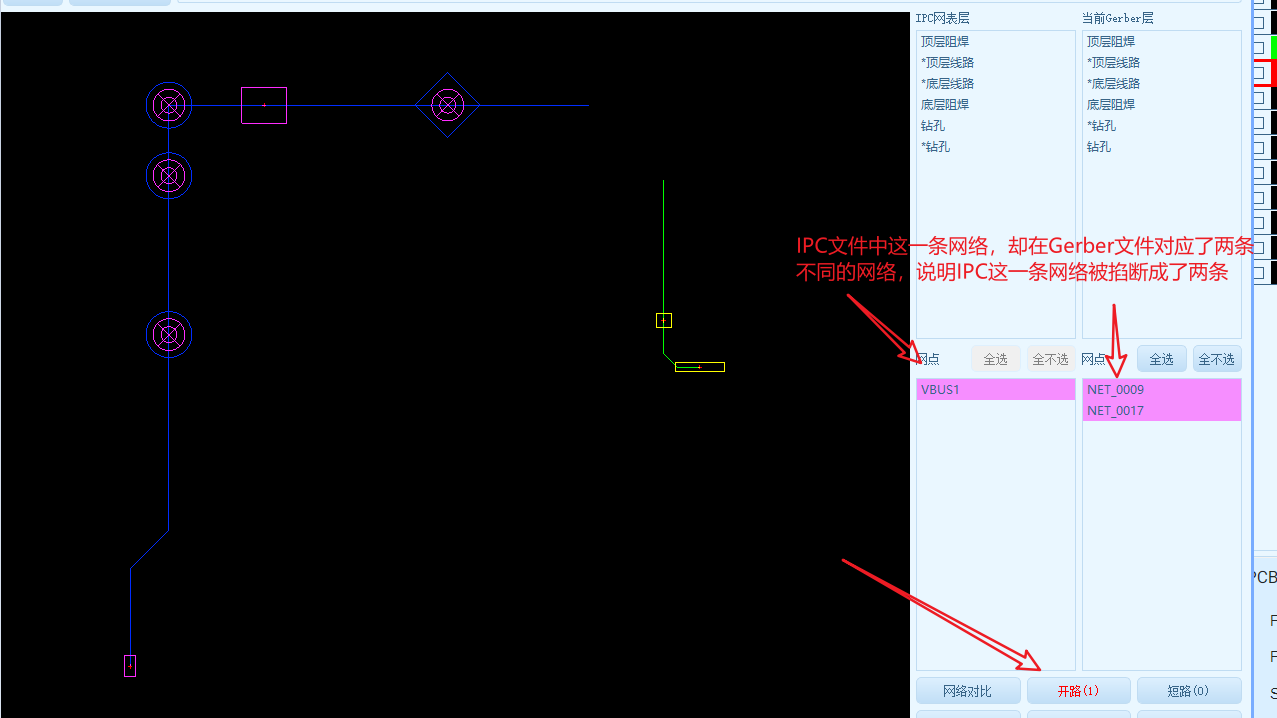 - 上图是IPC与Gerber网点都重叠在一起了,你刚接触的可能是一团糊看不清楚,按下图的操作,可以单独查看,两边的网络网点分布情况,下图是演示查看开路位置的IPC网点情况,反过来,你也可以查看Gerber文件的网点。