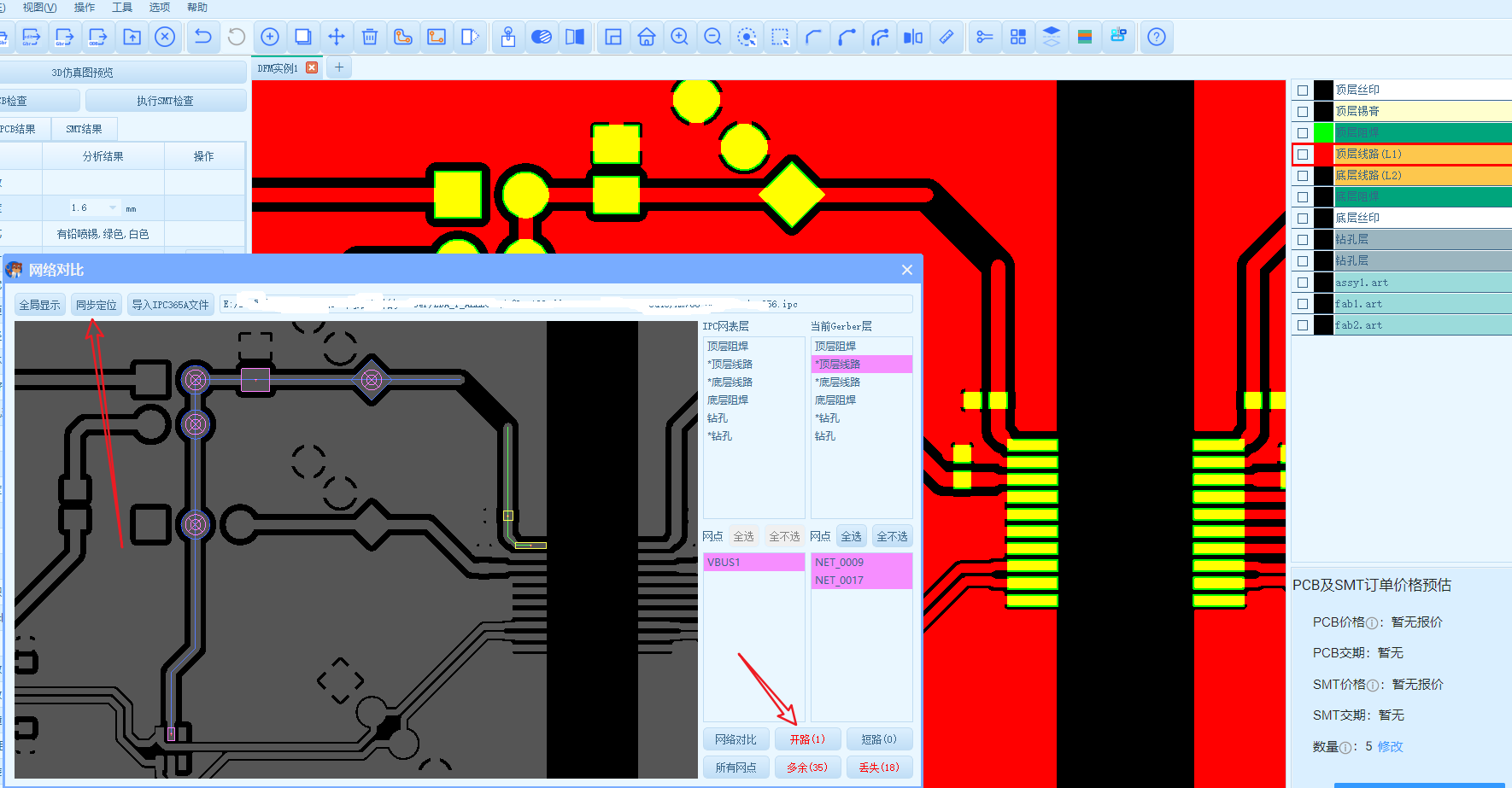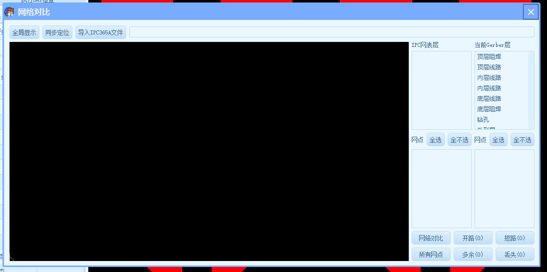 - 点击【网络对比】,马上就会分析出网点,网点分两部分,一个是IPC网络文件的网点,一个是Gerber文件的网点